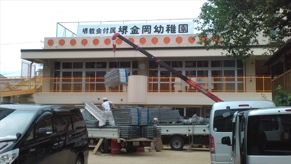堺教会附属 堺金岡幼稚園の改修工事が始まりました。 7月17日~8月末までの大がかりな工事です。 屋上防水、外壁補修・塗装、屋上のフェンス・看板・教室の面格子・テラスの鉄柵の新調、塔の時計の撤去、十字架の設置、また廊下と階段・テラスの木張りetc. 快適で、清潔で、美しく...、見違えるようにきれいになるでしょう! 教会幼稚園にふさわしく整えられますように。