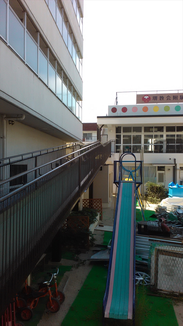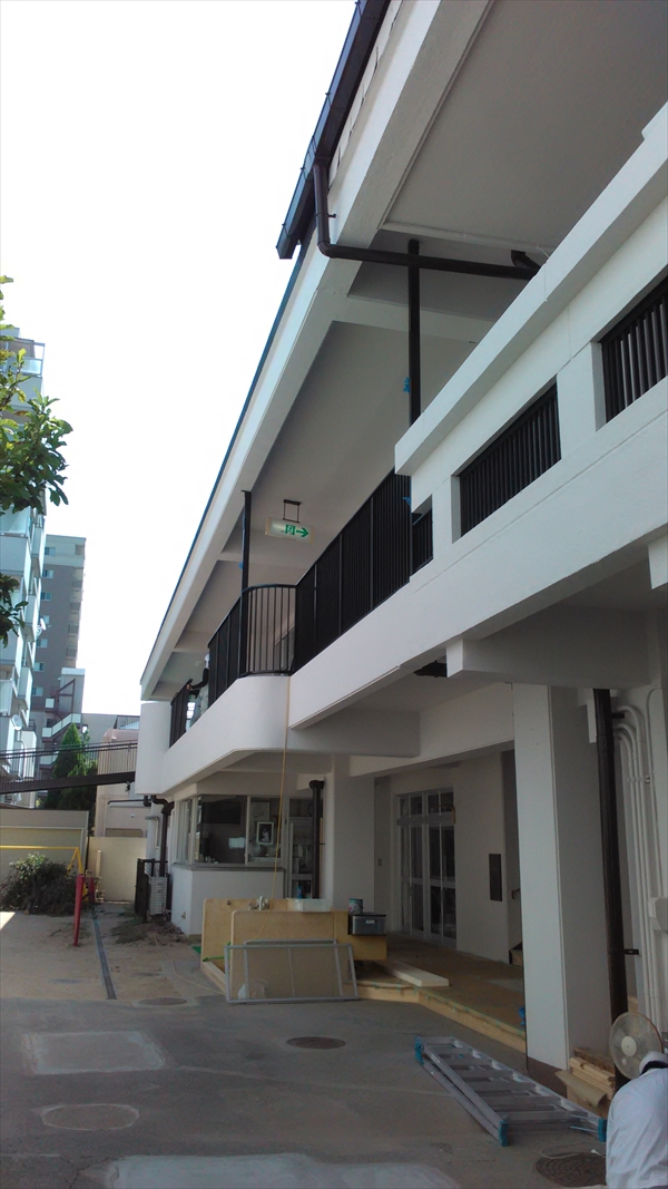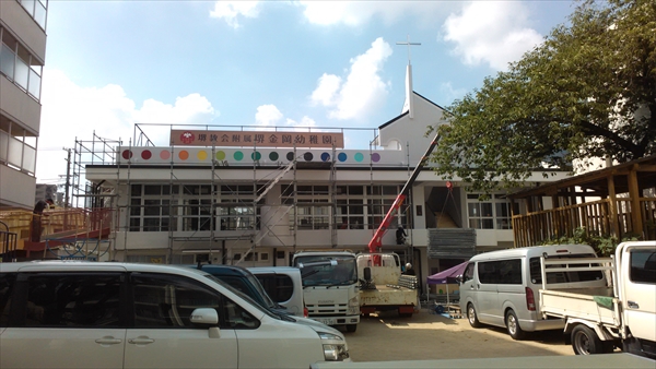 附属幼稚園、改修工事もいよいよ終わりが近づいてきました。足場が解体され、斜路の塗装も終わり、廊下・階段の召命も新調され、今日は二階テラスの柵が取り付けられています。