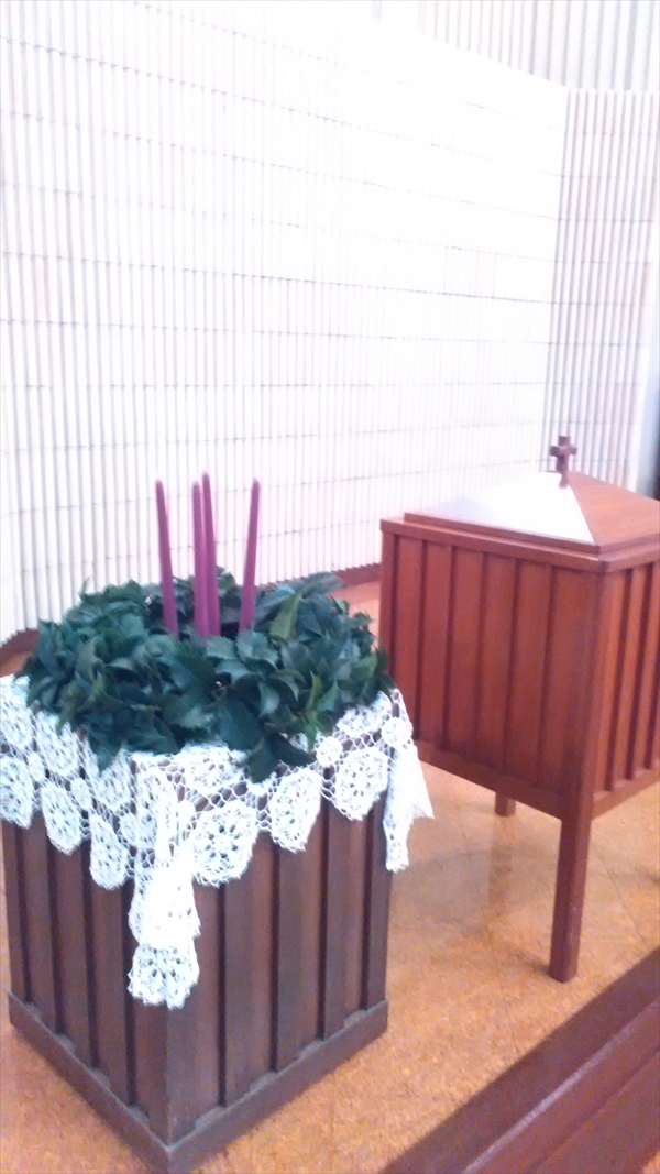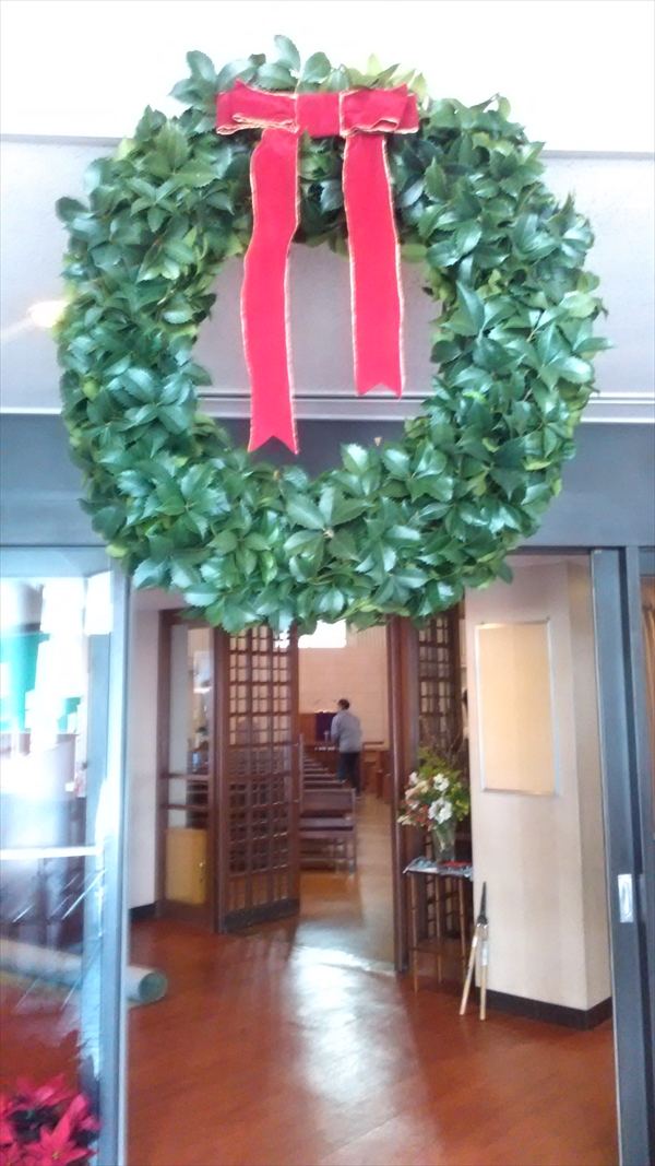 いよいよ明日からアドヴェント(待降節)。神の御子イエス・キリストのご降誕にむけて備える日々の始まりです。教会では毎年恒例のリースおよびクランツ作りが行われました。玄関先のリースは直系1メートルあります! 敷地内に生えているヒイラギ(本当はギンモクセイ?)の、葉の付いた枝で作ります。生葉のためクリスマスまではもちません。また16日(土)に葉っぱの差し替え作業が行われます。
