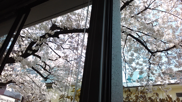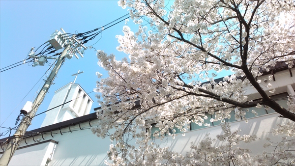 堺教会の桜が満開。いよいよ桜吹雪の始まりです。道行く人が立ち止まり、シャッター音がやみません。