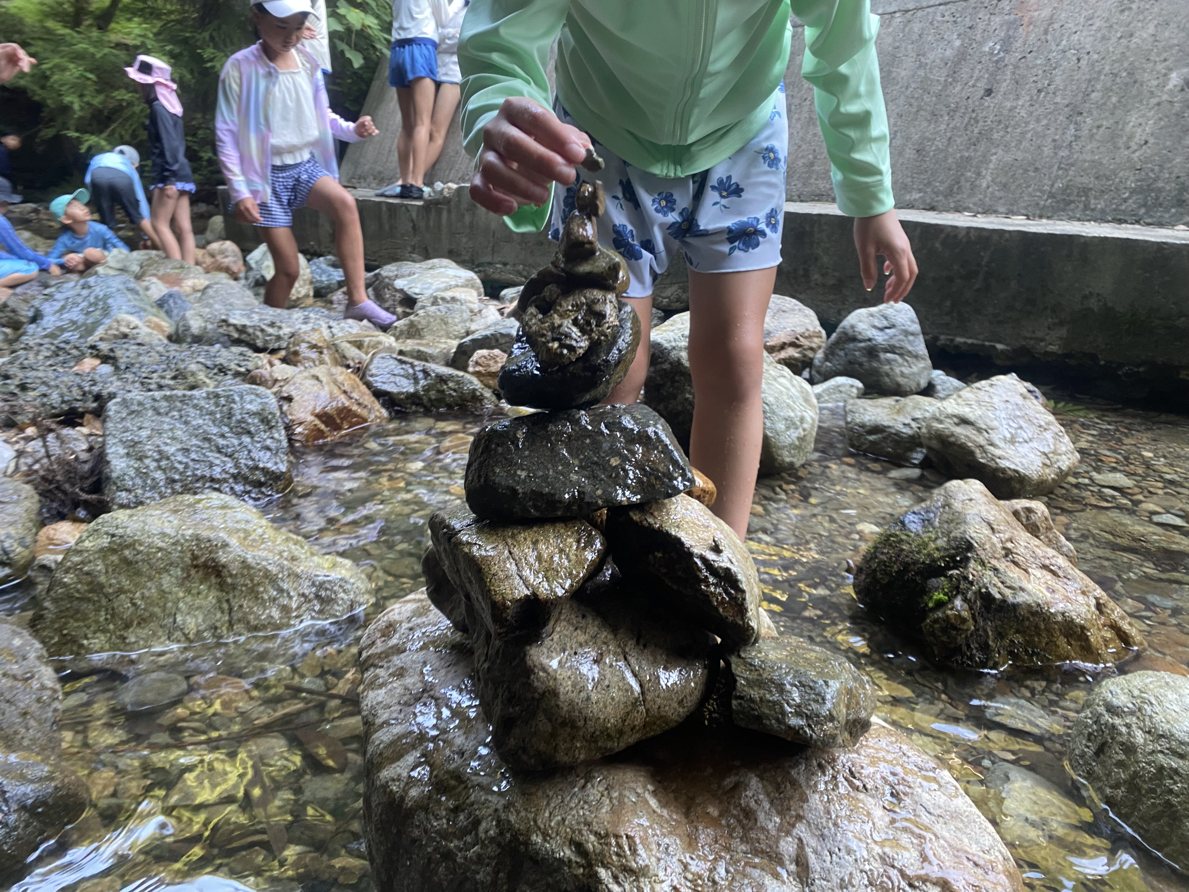 礼拝を終え、早速川遊びをしました! 石積みをしたり、魚を探したり...