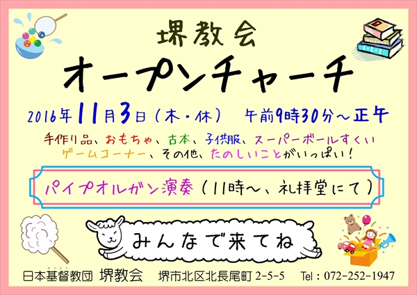 堺教会オープンチャーチ(旧バザー)が、11月3日(木・休)、午前9時半より開催されます。 手作り品・子供服・おもちゃ・古本・中古CD・軽食・こどもコーナー等ございます。 11時からは礼拝堂にてパイプオルガンのミニコンサートも行われます(11時半まで)。 どうぞ多くの皆さまがお越し下さり、よき交わりと楽しいひとときをお過ごしください。