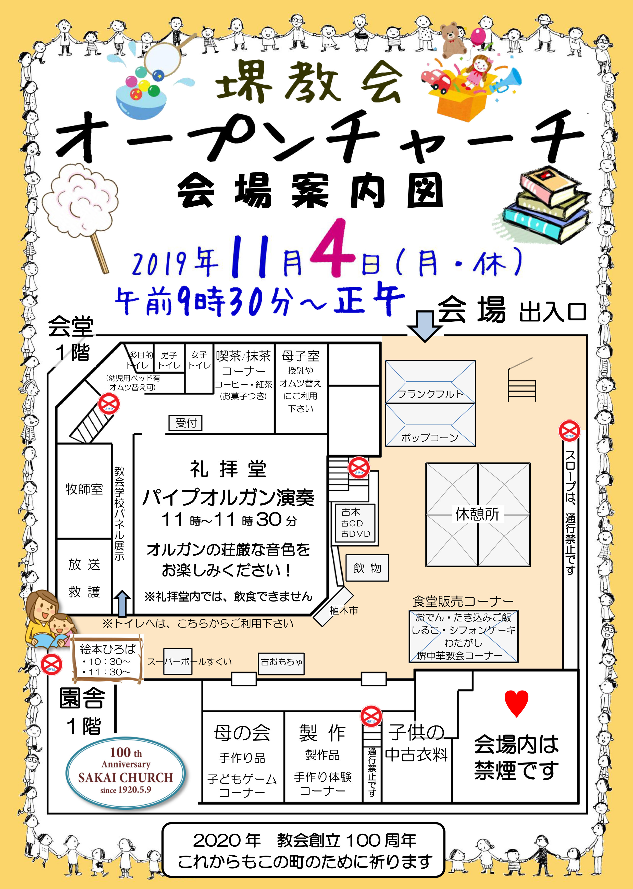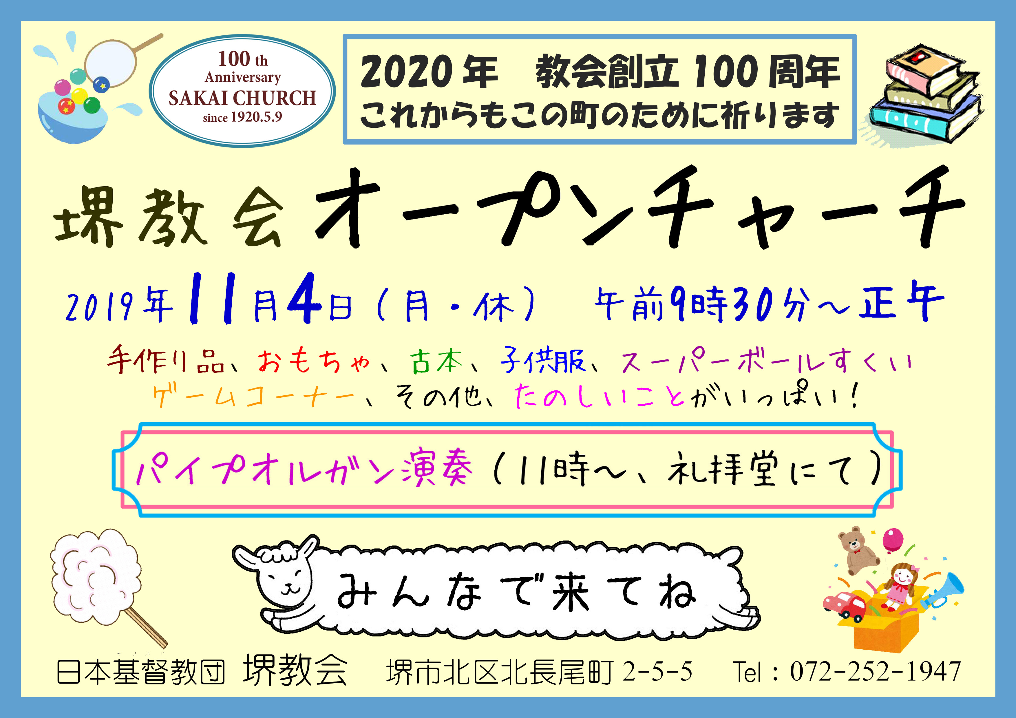 毎年恒例、堺教会オープンチャーチ(旧バザー)が、11月4日(月・休)、午前9時半より開催されます。 今年は4日(月)です! どうぞご承知おきください。 今年も手作り品・子供服・おもちゃ・古本・中古CD DVD・軽食・こどもコーナー等ございます。 11時からは礼拝堂にてパイプオルガンのミニコンサートも行われます(11時半まで)。 どうぞ多くの皆さまがお越し下さり、よき交わりと楽しいひとときをお過ごしください。